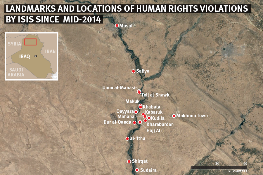 في مايو/أيار 2016، قابلت هيومن رايتس ووتش 20 من سكان القرى في منطقة مخمور، شمال غرب العراق، بعد أن فرّوا لمخيم للنازحين في إقليم كردستان العراق. كان داعش قد سيطر على القيارة وخباطة ومكوك، وغيرها من البلدات والقرى في منتصف 2014.