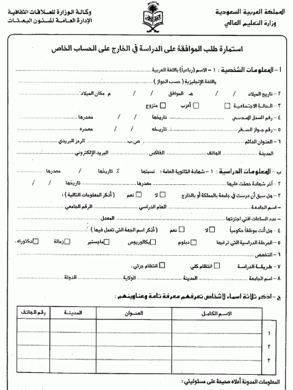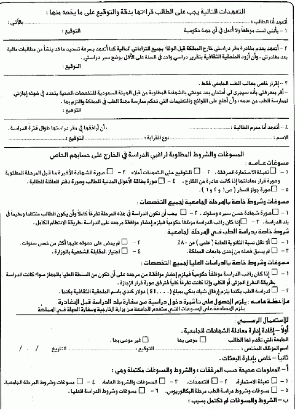 الملحق (ب): استمارة الدراسة بالخارج التي تتطلب موافقة ولي الأمر على دراسة الطالبات الجامعيات بالخارج