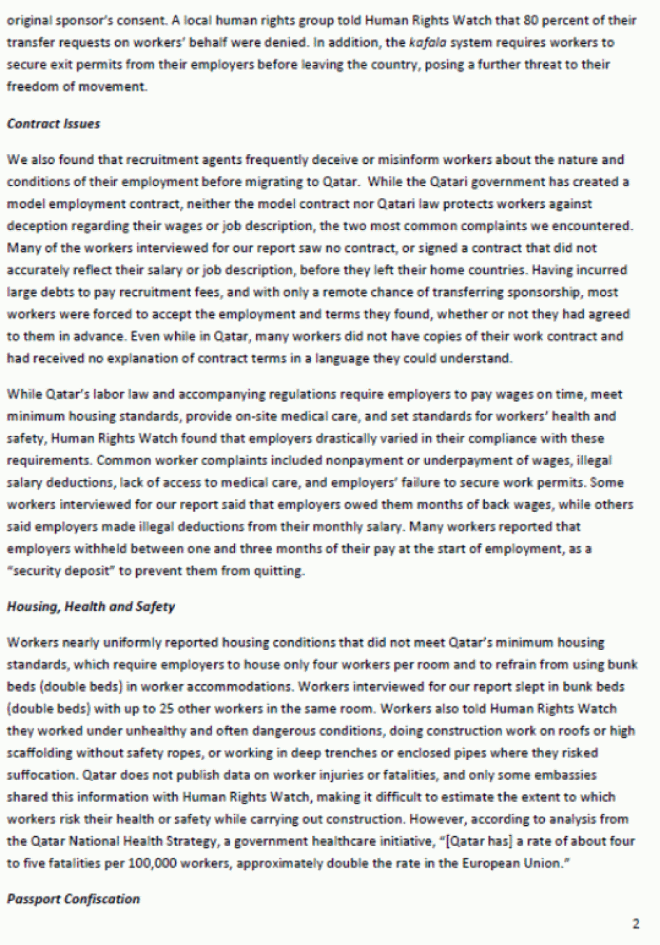 إلا أن القوانين القطرية تحرم عماء البناء من حق أساسي للعمال، هو حرية تكوين الجمعيات وحق المفاوضة الجماعية، مما يعني استبعاد هذا الخيار من حيث المبدأ. وهو الأمر الذي يزيد من أهمية أن تتخذ الفيفا والكيانات العامة والخاصة المشاركة في تحضيرات كأس العالم في قطر، أن تتخذ الخطوات المناسبة لضمان احترام حقوق العمال، لا سيما نظراً لإخفاق قطر في فرض الحظر على الممارسات غير القانونية، من قبيل مصادرة جوازات السفر، ودفع العمال لرسوم استقدامهم للعمل، وفرض حد أدنى للأجر، وحظر مشاركة العمال الوافدين في النقابات والإضرابات، وقوانين الكفالة التقييدية التي تخلف العمال في أوضاع كثيراً ما توصف بأنها استرقاق معاصر.[36] على الحكومة القطرية التزام مبدئي بحماية حقوق الإنسان، بما في ذلك حقوق العمال، لكن مختلف الأطراف بقطاع الأعمال عليها مسؤولية احترام حقوق الإنسان وتفادي التواطؤ أو التورط في الانتهاكات.