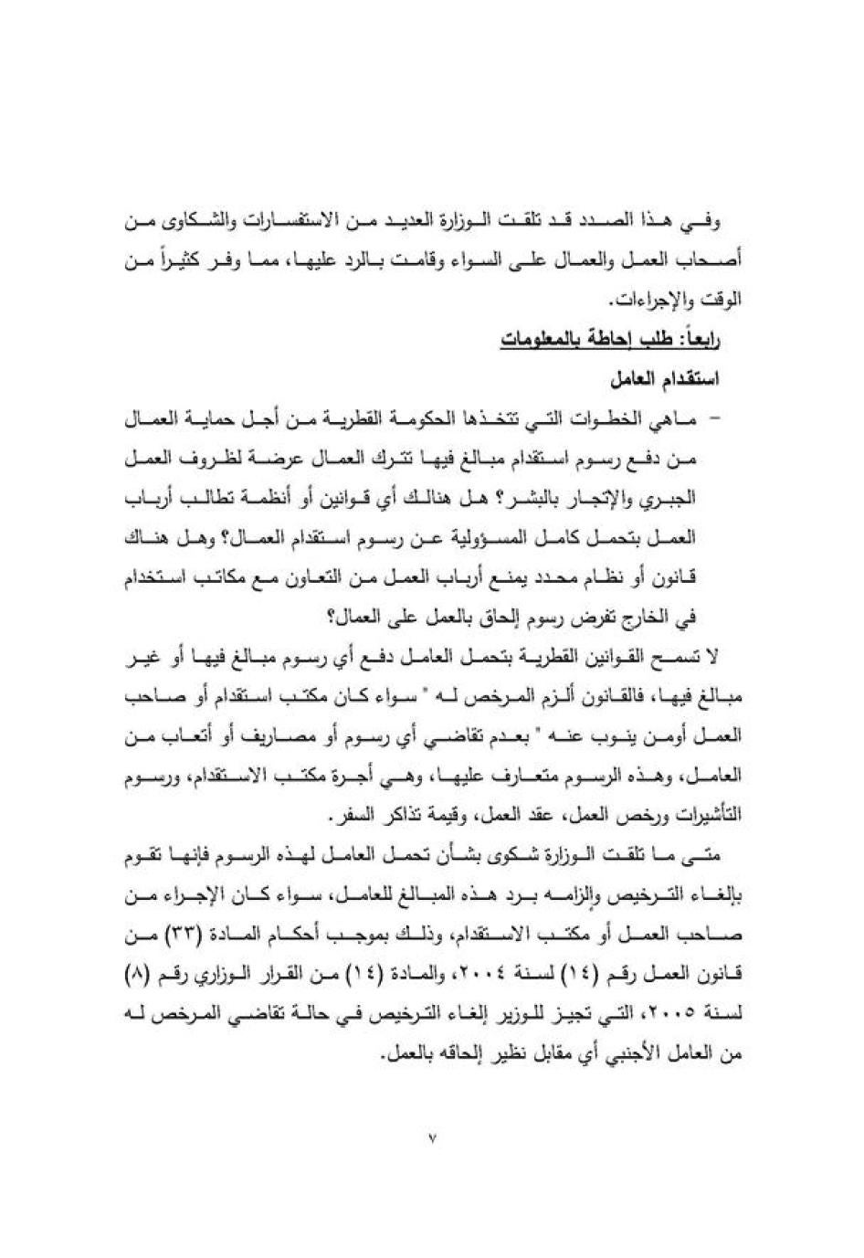رداً على طلب بمعلومات إضافية تم إرساله إلى وزارات قطرية ومسؤولين قطريين، ذكرت وزارة العمل أن "قانون العمل (14 لسنة 2004) والقرارات الوزارية الصادرة بناء عليه، تحظر بكل حزم على أي صاحب عمل أو مكتب استقدام، تلقي أي رسوم أو عمولات على استقدام عمال إلى قطر. تفرض وزارة العمل هذه الأحكام بحزم، وهذه الأعمال تعتبر إتجاراً بالبشر، وهو محظور بموجب القانون. لم تتلق الإدارة شكوى من أي عامل طلب منه صاحب عمله أن يغطي بنفسه نفقات ورسوم استقدامه للعمل". [56] وأضافت الرسالة: "في حال تلقي الوزارة لشكوى بأن عاملاً سدد هذه الرسوم، تسحب التراخيص وتطالب المُخالف بتعويض العامل، سواء كان صاحب عمل أو مكتب استقدام للعمل". [57]