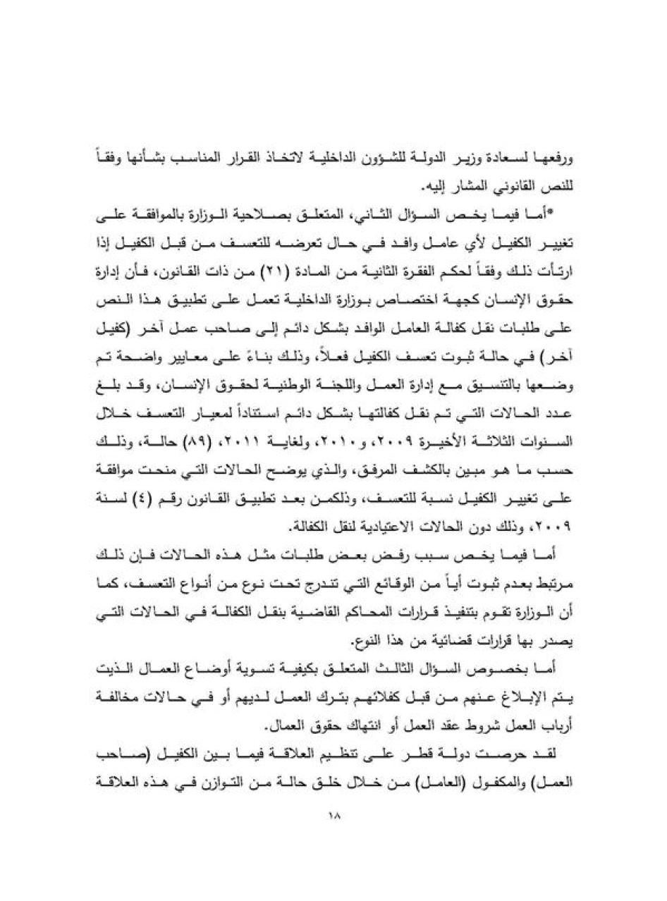 [172] رسالة من وزارة العمل القطرية، 1 نوفمبر/تشرين الثاني 2011، ص 11.
