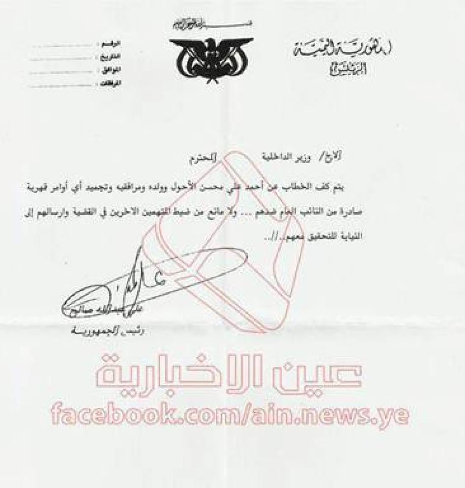 [163] طلب تصدي المحكمة بتحريك الدعوى الجزائية ضد من لم يشملهم قرار الاتهام إعمالاً لنص المادة (32) أ.ج. ("طلب تحريك الدعوى الجزائية")، مقدم بتاريخ 13 أكتوبر/تشرين الأول 2012 لتحريك اتهامات إضافية، ص 27. نشرت صحيفة المعارضة "مآرب برس" المذكرة في أبريل/نيسان 2011 ثم أصدرت اعتذاراً الشهر التالي قائلة إن وزارة الداخلية وفرت للصحيفة وثيقة رسمية تحمل نفس رقم التعريف الخاص بمذكرة المصري المزعومة، لكن بتاريخ 11 مارس/آذار 2011. انظر: "الداخلية تنفي صحة المذكرة التي تحدثت عن توزيع أسلحة.. وتؤكد أنها وثيقة مزورة"، مأرب برس.نت، 5 مايو/أيار 2011: http://marebpress.net/news_details.php?sid=33640&lng=arabic (تمت الزيارة في 24 نوفمبر/تشرين الثاني 2012).