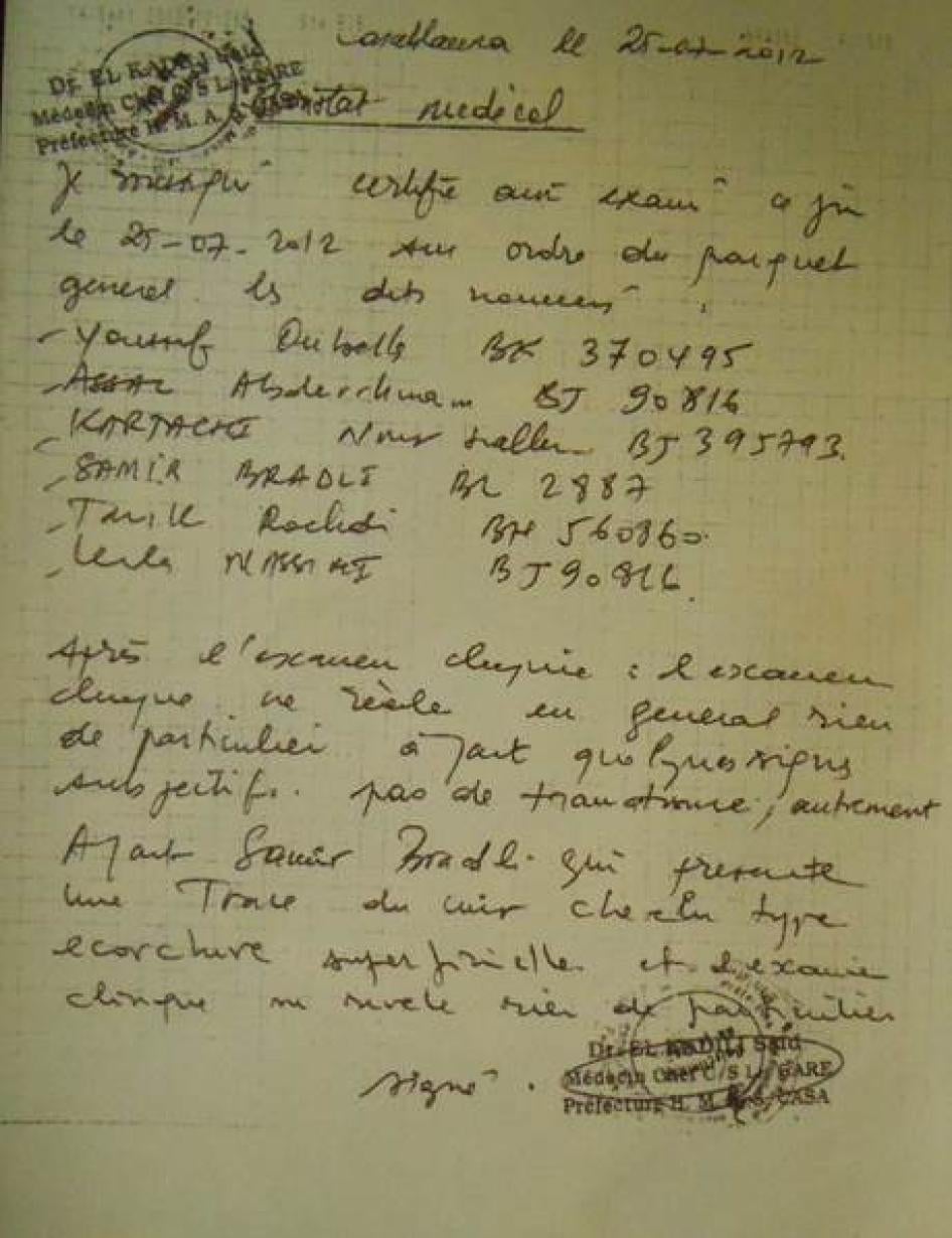 في الواقع، فإن عددا من المتهمين، بمن فيهم بعض الذين وردت أسماؤهم أعلاه، أخبروا قاضي التحقيق أن الشرطة قد أخضعتهم للتعذيب أو سوء المعاملة، وأنهم أجبروا على توقيع على المحاضر دون قراءتها. انظر الملحق الثالث أدناه.