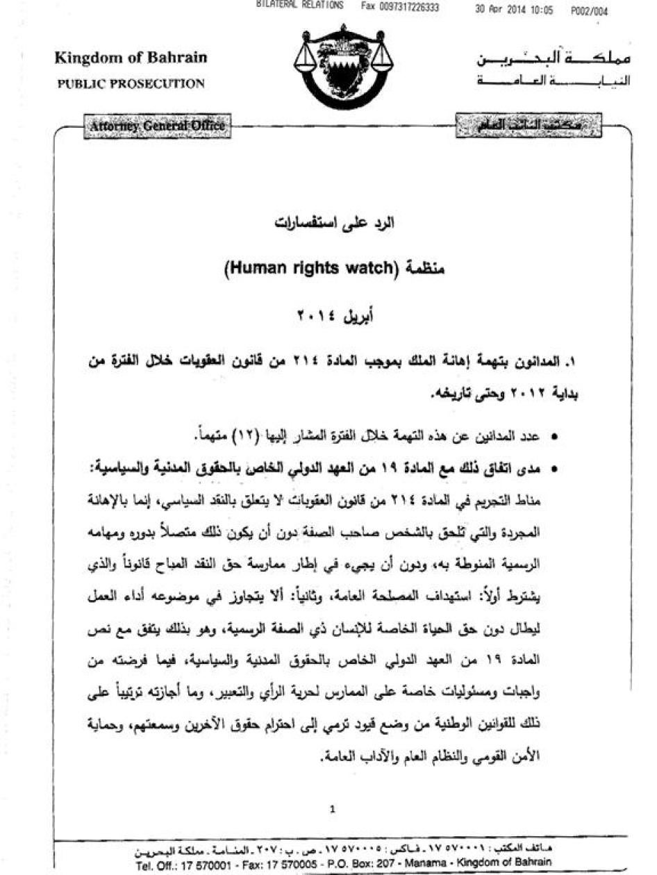مُلحق بالتقرير كل من رسالة هيومن رايتس ووتش إلى د. علي فضل البوعينين، النائب العام البحريني، ورد مكتب النائب العام على الرسالة.