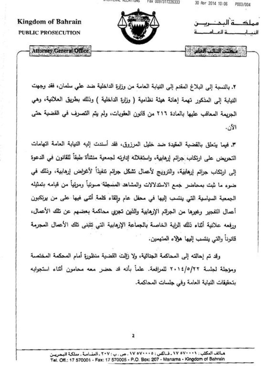 وبعد ذلك، في نوفمبر/تشرين الثاني 2013 اتهمت النيابة العامة الشيخ علي سلمان رئيس مجموعة الوفاق، وهي جماعة المعارضة السياسية الأساسية المعترف بها أمام القانون في البحرين. لم تتقدم المحكمة بعد بهذه الاتهامات، لكن اطلع عليها سلمان ويمكن أن تُعلن ضده في أي وقت للبدء في مداولات قضية جنائية. تزعم هذه الاتهامات أن سلمان أهان وزارة الداخلية، بناء على تعليقات مقتضبة أدلى بها في افتتاح معرض، وتعرض فيها للحديث عن انتهاكات حقوق الإنسان في البحرين. وعلى وجه التحديد تحدث سلمان عن "الانتهاكات" ضد المتظاهرين، كما وثقتها اللجنة البحرينية المستقلة لتقصي الحقائق، وأعرب عن أمله في أن تحتضن البحرين جميع البحرينيين دون استثناء، دون تفرقة أو تمييز". طبقاً لوزير الدولة لشؤون الاتصالات فإن هذه التعليقات "مهينة لوزارة الداخلية".