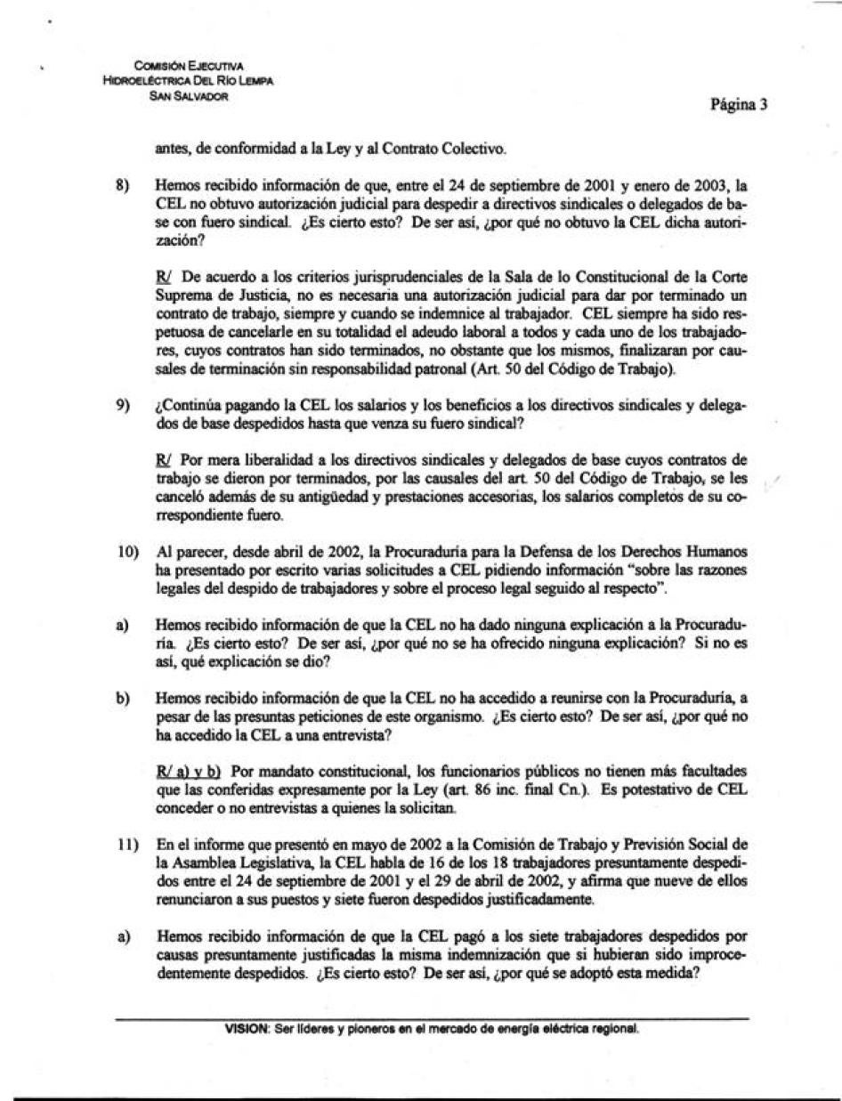 Tal como se alega en los casos de la Comisión Ejecutiva Hidroeléctrica del Río Lempa (CEL) y de Lido, S.A. de C.V.,––que se describen en el capítulo VII más abajo–– los empleadores despiden de manera rutinaria a aquellos trabajadores que se encuentran afiliados a organizaciones sindicales, pagando las pequeñas multas que corresponden de acuerdo con la ley vigente, como un mecanismo que les permite librarse de sindicalistas. Lido presuntamente despidió a treinta afiliados sindicales en mayo de 2002 y a otros veintidós entre el 14 de octubre y el 4 de noviembre del mismo año, pagándoles el monto indemnizatorio mínimo. Asimismo, entre el 24 de septiembre de 2001 y el18 de octubre de 2002 la CEL presuntamente despidió a cerca de treinta afiliados sindicales. Aunque la CEL adujo que algunos trabajadores renunciaron y que otros fuerondespedidos con causa, también les ofreció la indemnización mínima correspondiente en casos de despido ilegal.