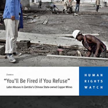 Le rapport de 122 pages, intitulé ‘You’ll Be Fired If You Refuse’: Labor Abuses in Zambia’s Chinese State-owned Copper Mines (« ‘Vous serez licenciés si vous refusez’ : Violations des lois du travail dans les mines cuprifères d’État chinoises en Zambie »), décrit en détail les abus persistants commis dans les mines dirigées par des Chinois, notamment les mauvaises conditions d’hygiène et de sécurité, les équipes régulières devant travailler 12 heures, voire 18 heures, dans des conditions ardues, ou encore les activités antisyndicales, soit autant de violations de la législation nationale zambienne et des normes internationales du travail. Les quatre compagnies minières cuprifères dirigées par des Chinois en Zambie sont des filiales de la China Non-Ferrous Metals Mining Corporation, une entreprise d’État qui relève du plus haut organe exécutif de Chine. L’exploitation du cuivre est le moteur de l’économie zambienne, contribuant à presque 75 pour cent des exportations du pays et aux deux tiers du revenu du gouvernement central.