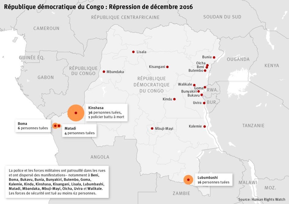 « Le refus de Kabila de quitter ses fonctions comme l’exige la Constitution a plongé la RD Congo dans une crise politique, économique et des droits humains, qui pourrait avoir des conséquences désastreuses pour la région », a conclu Ida Sawyer. « Pour éviter que la situation déjà explosive ne dégénère, les partenaires régionaux et internationaux de la RD Congo devraient faire pression sur Kabila pour qu’il se retire afin de permettre l’organisation d’élections pacifiques et crédibles. »