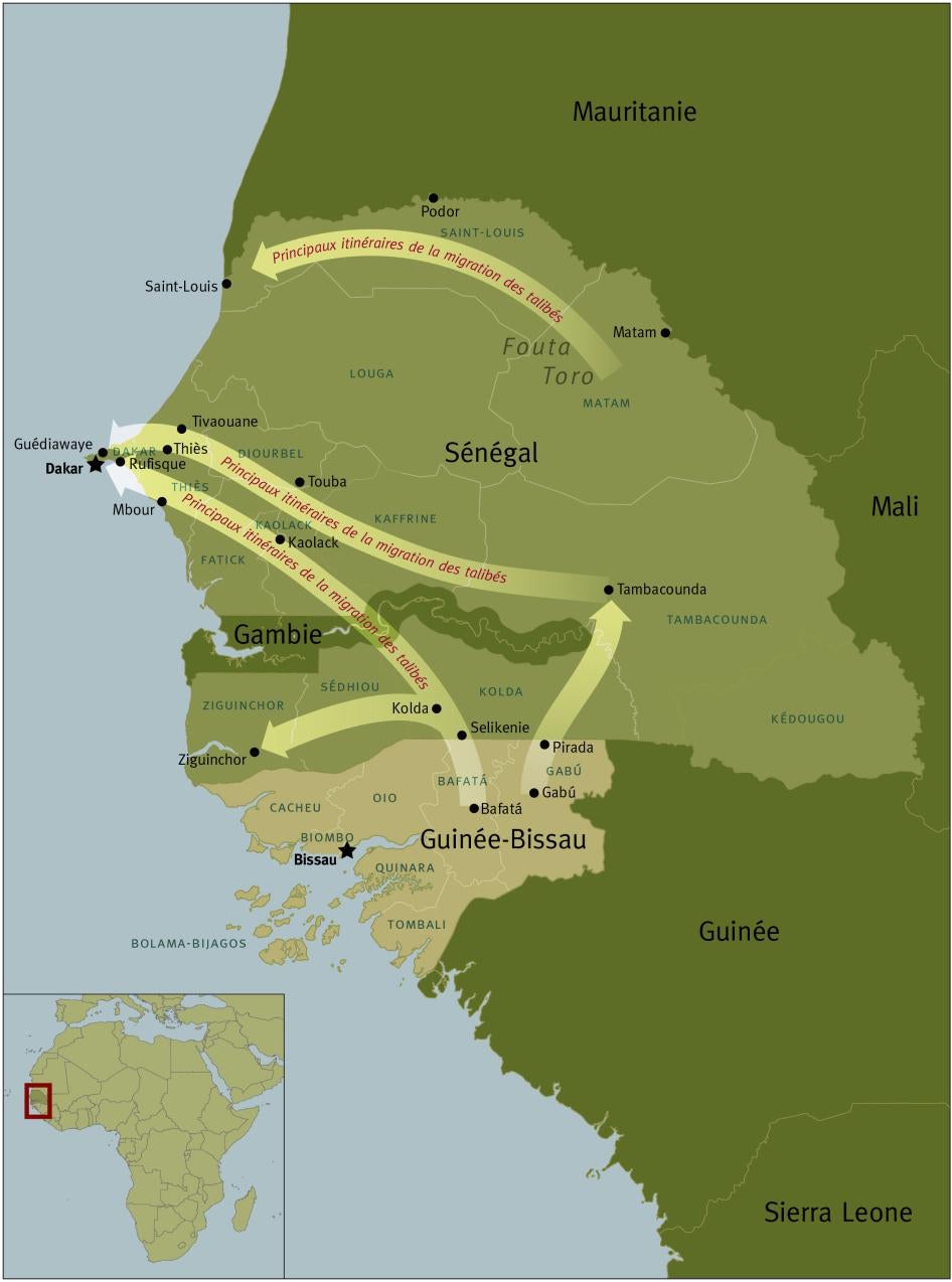 Ce rapport documente également la mendicité forcée, la traite des personnes et les problèmes liés à la migration des talibés, notamment le transport transrégional ou transfrontalier illicite de groupes de talibés ; des cas de talibés abandonnés par leur marabout ou leurs parents ; et des centaines de talibés qui finissent chaque année dans la rue ou dans un centre d’accueil pour enfants après s’être enfuis d’un daara où ils étaient soumis à des abus. Le rapport révèle le rôle que jouent certains parents dans la perpétuation de ces pratiques en fermant les yeux sur le problème, ou en renvoyant leur enfant dans un daara caractérisé par l'exploitation ou d’autres abus.