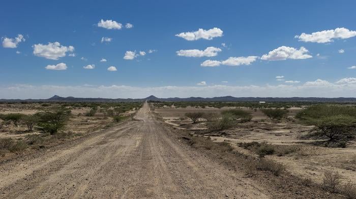 Un chemin de terre dans le comté de Turkana, au Kenya. Le comté de Turkana et les rives occidentales du lac Turkana sont connus mondialement comme le berceau de l’humanité, c’est là que les archéologues ont trouvé les ancêtres les plus anciens de l’homme moderne. Toutefois, la population du comté de Turkana qui est l’une des plus pauvres du Kenya suit actuellement une croissance rapide et rencontre ainsi des difficultés croissantes pour l’accès à l’eau, à la nourriture, à la santé et à la sécurité. La région subit depuis longtemps des périodes de sécheresse cyclique mais les nouveaux schémas climatiques associés aux menaces causées au lac Turkana par les projets d’hydroélectricité et d’irrigation en Éthiopie constituent des dangers immédiats et à long terme pour le lac et la population croissante dont la survie en dépend.