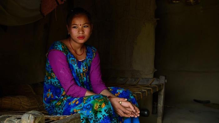 Ganga M., une jeune Népalaise de 17 ans, enceinte de cinq mois à la suite d’un mariage arrangé quand elle avait 16 ans avec un homme qui travaille comme cuisinier en Inde, photographiée chez elle à Kailali (ouest du Népal). 25 avril 2016.