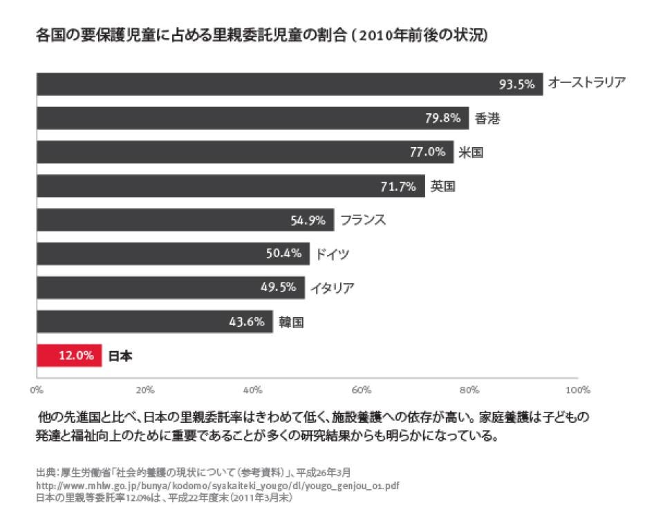 東日本大震災による震災孤児と同様に、社会的養護の下にあるすべての子どもが家庭で暮らす権利をもっている。実親との生活が適わないのであれば、近い親戚や養親、里親による代替的養護を提供すべきである。
