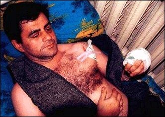 Ramsan Rasayev, de ventinueve años, está en el hospital de la zona Sunzha en Ingushetia el 20 de diciembre de 1999. Ramsan sostiene que el 16 de diciembre de 1999, él fue detenido y severamente golpeado por soldados rusos en el retén Assinovski, el punto de cruze principal con Ingushetia. Él declara que los soldados del retén lo golpearon con sus rifles, lo forzaron a pelear con un soldado recluta, le dieron patadas en sus órganos genitales, y lo hirieron con cuchillas hasta que un policia de Ingushetia tuvo que intervenir y le aseguró su libertad.