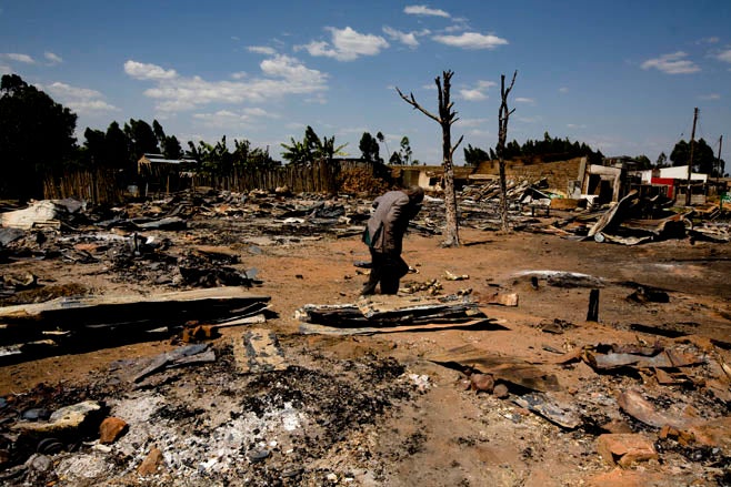 A man walks through ruins of an area of Chepilat in the Rift Valley Province, February 2008. The burning of homes by Kalenjin men, forced residents of both the Kisii and the Kikuyu ethnic groups to flee.