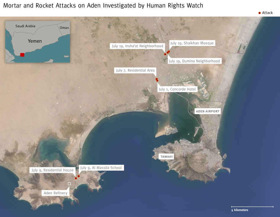 (Beirut) – Pro-Houthi forces have repeatedly fired mortar shells and rockets indiscriminately into populated areas in the southern Yemeni port city of Aden in violation of the laws of war. In the deadliest attack, on July 19 in Dar Saad district, mortar fire killed several dozen civilians, including children.