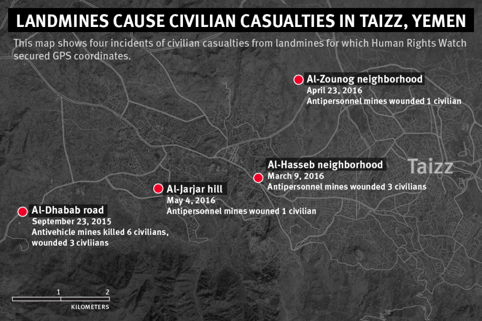 On August 9, 2016, 11 civilians, including seven children, were killed by an antivehicle mine in al-Waziyah, a western part of Taizz, a local activist told Human Rights Watch. Two of the children were 4 years old.