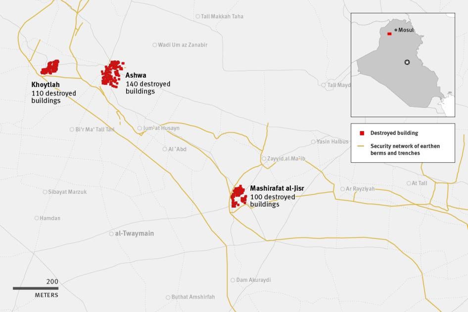 To the southwest of Mosul, Human Rights Watch documented looting and extensive demolition of buildings in three villages using explosives, heavy machinery, and fire. Witness statements about the extent and timing of the demolitions, between late December and early February, were corroborated by satellite imagery showing the destruction of at least 350 buildings, including the main mosque, in the village of Ashwa during that time. Satellite imagery reviewed by Human Rights Watch showed that the abuses took place after anti-ISIS forces incorporated the villages into a large network of earthen berms and trenches. Locals told Human Rights Watch the only armed forces in the areas taken from ISIS were different groups within the PMF.