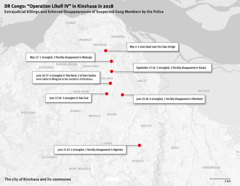 The extrajudicial executions and enforced disappearances Human Rights Watch documented took place between May and September in Kinshasa’s Kalamu, Kisenso, and Limete communes. Three of those killed were boys, ages 16 and 17. A 15-year-old boy is among the disappeared. The victims included known or former kulunas and local residents who, acquaintances said, were not involved in criminal activities.