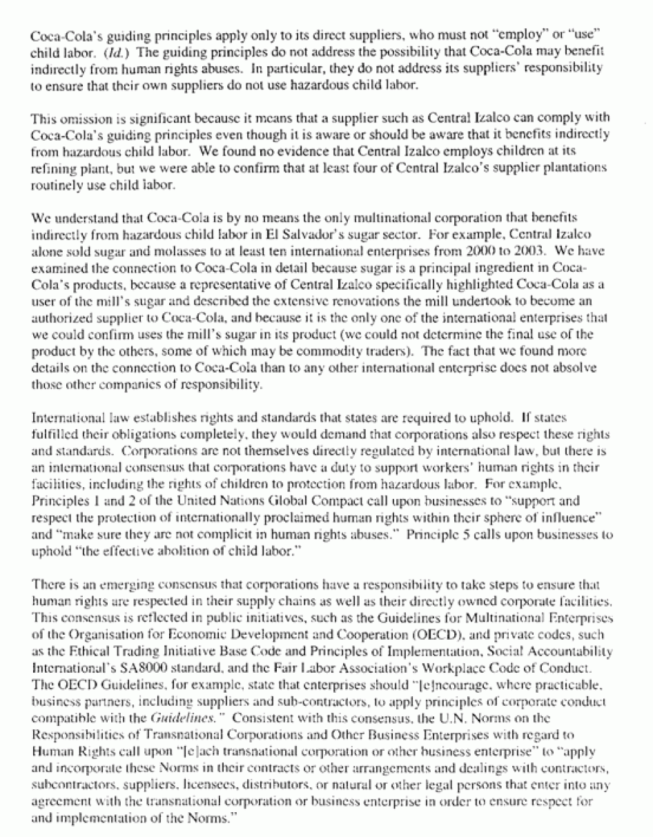Coca-Cola's supplier guiding principles provide that its direct suppliers "will not use child labor as defined by local law."[9]With the adoption of these principles, Coca-Cola has recognized its responsibility under international standards to take steps to ensure that human rights are respected in its supply chain as well as in its directly owned corporate facilities.[10]But Coca-Cola's guiding principles apply only to its direct suppliers; they do not address its suppliers' responsibility to ensure that their own suppliers do not use hazardous child labor.This omission is significant because it means that Coca-Cola's supplier mill can comply with Coca-Cola's guiding principles even though it is aware or should be aware that that the sugar it refines is harvested in part by child labor.