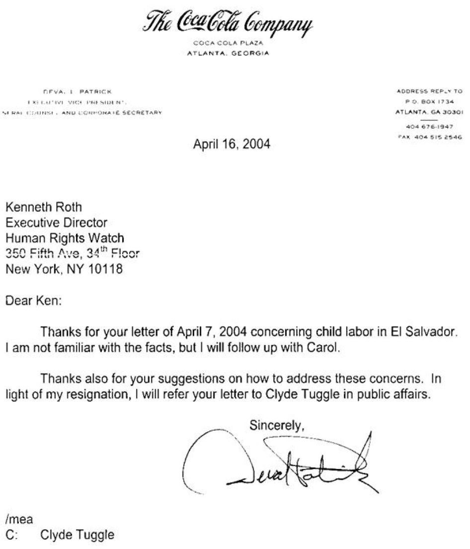 [271] Letter from Michael Bochenek, counsel, Children's Rights Division, Human Rights Watch, to Douglas N. Daft, chairman and chief executive officer, The Coca-Cola Company, October 14, 2003 (certified article number 7000 0600 0027 2482 8734, postmarked Richmond, Vermont, October 15, 2003; return receipt signed by Leon Massey and postmarked Atlanta, Georgia, October 17, 2003).See also Letter from Kenneth Roth, executive director, Human Rights Watch, to Deval L. Patrick, executive vice president, general counsel, and corporate secretary, The Coca-Cola Company, April 7, 2004 (DHL Waybill No. 9148979954; received April 8, 2004, by J. Howard); Letter from Kenneth Roth, executive director, Human Rights Watch, to Carol Martel and Clyde Tuggle, Office of Public Affairs, The Coca-Cola Company, April 30, 2004 (DHL Waybill No. 9148982043; received May 3, 2004, by J. Howard).