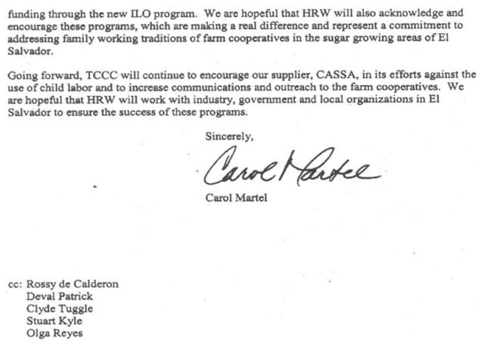 [272] Letter from Carol M. Martel, director, public affairs, The Coca-Cola Company, to Michael Bochenek, counsel, Children's Rights Division, Human Rights Watch, November 18, 2003.