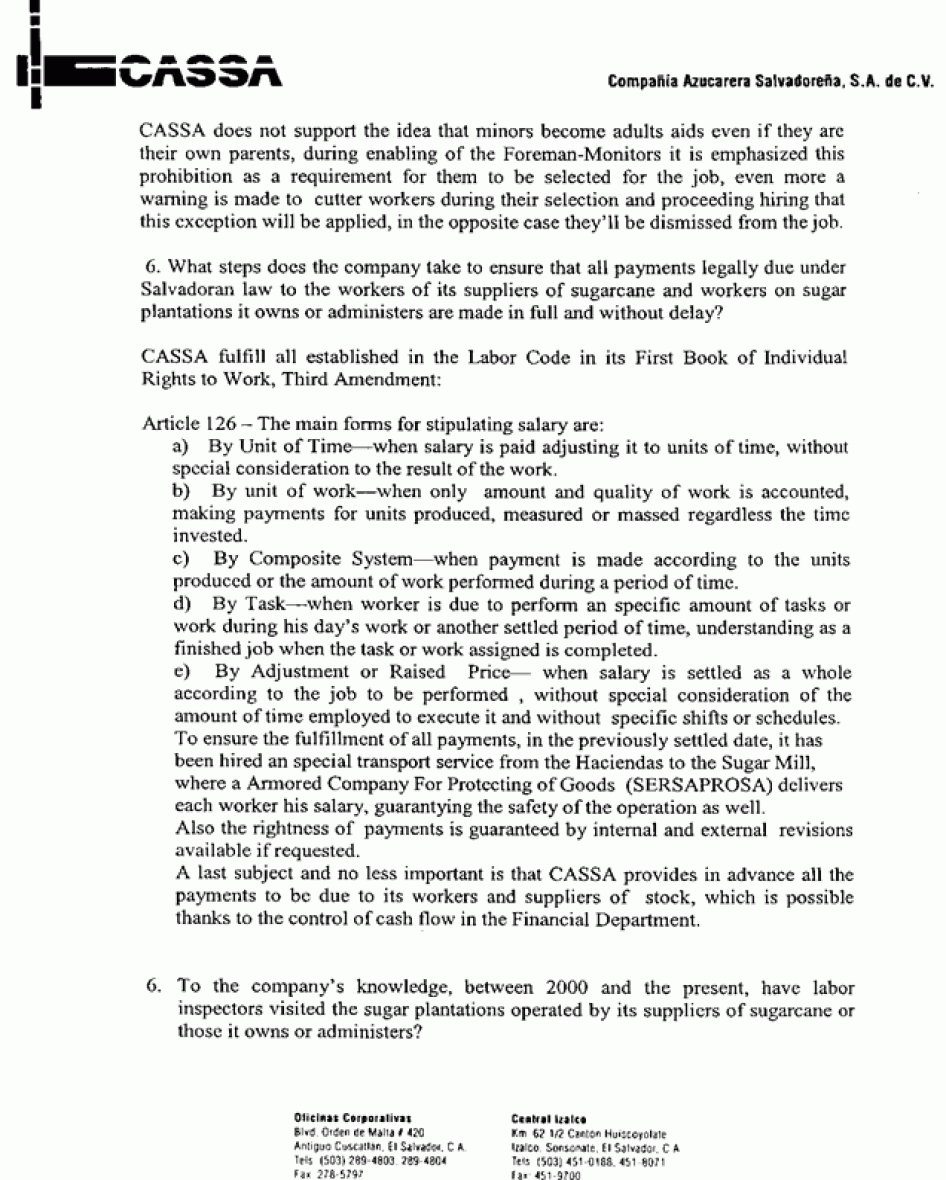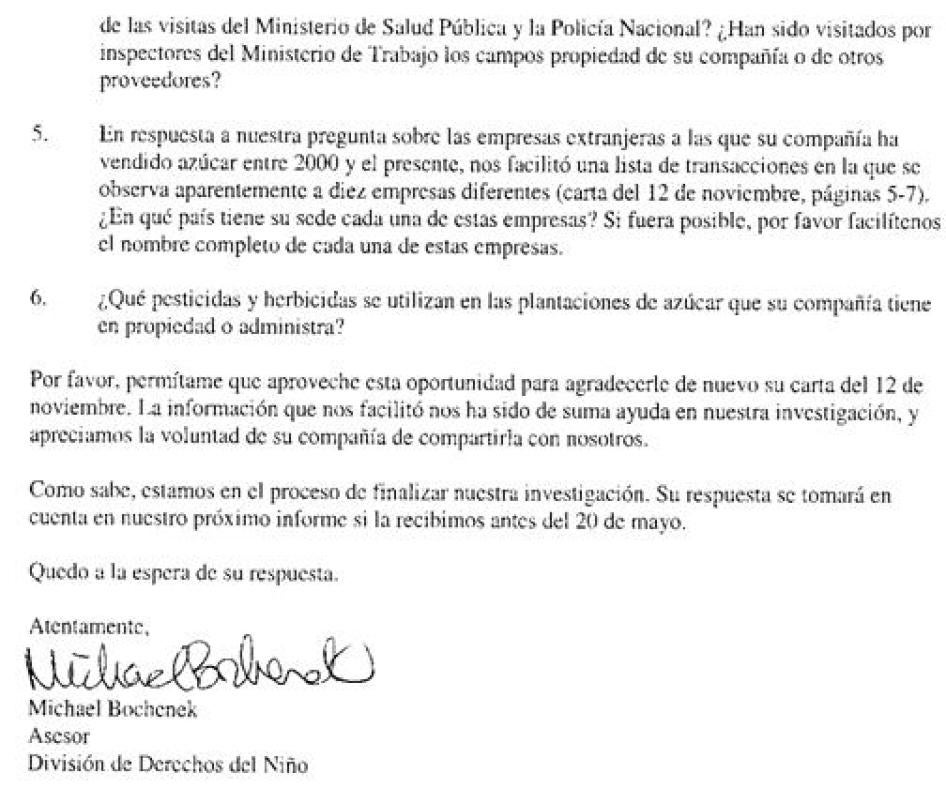 [243] Letter from Michael Bochenek, counsel, Children's Rights Division, Human Rights Watch, to Ingenio San Francisco, January 21, 2004 (DHL Air Waybill No. 7845587805; received January 27, 2004, by Juan Reyes); Letter from Michael Bochenek, counsel, Children's Rights Division, Human Rights Watch, to Ingenio La Cabaa, S.A. de C.V., January 21, 2004 (DHL Air Waybill No. 7845587816; received 11:40 a.m., January 26, 2004, by Doris); Letter from Michael Bochenek, counsel, Children's Rights Division, Human Rights Watch, to Compaa Azucarera Salvadorea, S.A. de C.V., October 14, 2003 (registered article No. RA 832981195US, postmarked Richmond, Vermont, October 15, 2003; return receipt signed and postmarked Nueva San Salvador, La Libertad, El Salvador, October 27, 2003); Letter from Juan Eduardo Interiano, general manager, Compaa Azucarera Salvadorea, S.A. de C.V., to Michael Bochenek, counsel, Children's Rights Division, Human Rights Watch, November 12, 2003; Letter from Michael Bochenek, counsel, Children's Rights Division, Human Rights Watch, to Juan Eduardo Interiano, general manager, Compaa Azucarera Salvadorea, S.A. de C.V., December 4, 2003 (registered article no. RA 111950168US, postmarked Crown Point, New York, December 8, 2003; no return receipt received); Letter from Michael Bochenek, counsel, Children's Rights Division, Human Rights Watch, to Juan Eduardo Interiano, general manager, Compaa Azucarera Salvadorea, S.A. de C.V., March 17, 2004 (DHL Air Waybill No. 7845587293; received March 22, 2004, 3:39 p.m., by Maria); Letter from Michael Bochenek, counsel, Children's Rights Division, Human Rights Watch, to Juan Eduardo Interiano, general manager, Compaa Azucarera Salvadorea, S.A. de C.V., May 6, 2004 (DHL Air Waybill No. 7845586976; received May 10, 2004, 3:49 p.m., by Maria; Letter from Juan Eduardo Interiano, general manager, Compaa Azucarera Salvadorea, S.A. de C.V., to Michael Bochenek, counsel, Children's Rights Division, Human Rights Watch, dated April 30, 2004, and faxed to Human Rights Watch on May 20, 2004.