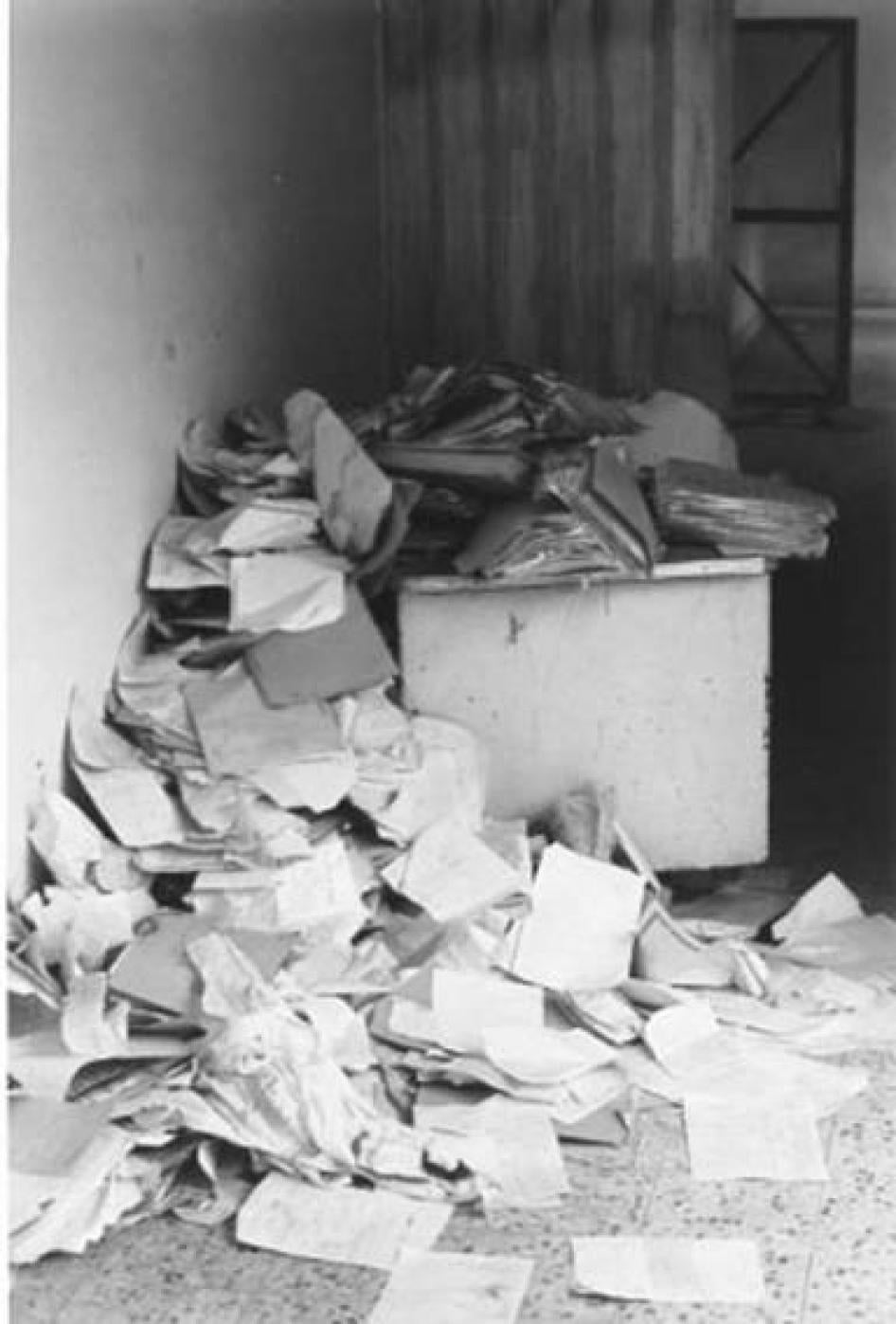 Documents strewn on desk and floor in security prison in Kirkuk, April 2003, the day after the city fell to Kurdish and U.S forces. 2003 Eric Stover/Human Rights Watch
