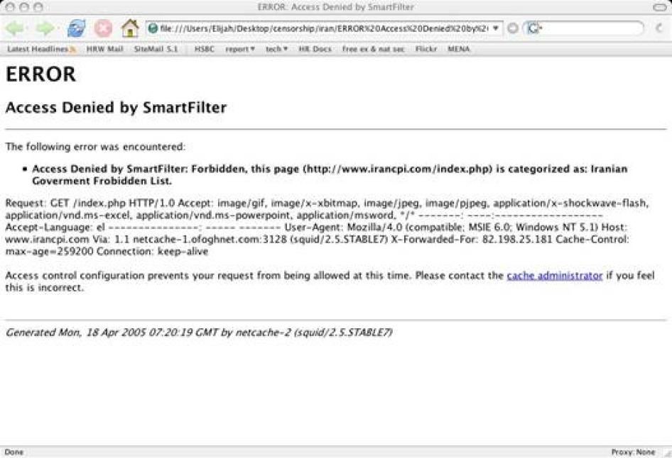 [385] See, for example, Open Net Initiative, Country Study: Internet Filtering in Iran, 2004-2005, June 21, 2005.