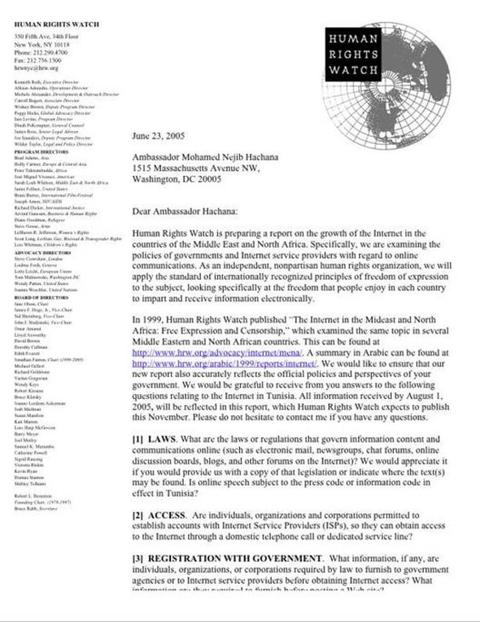 In 1999, Human Rights Watch sent a uniform letter containing questions about Internet policies to seventeen regional governments. The official responses to that query were reproduced and analyzed in Human Rights Watch's 1999 report, The Internet in the Mideast and North Africa.[17]
