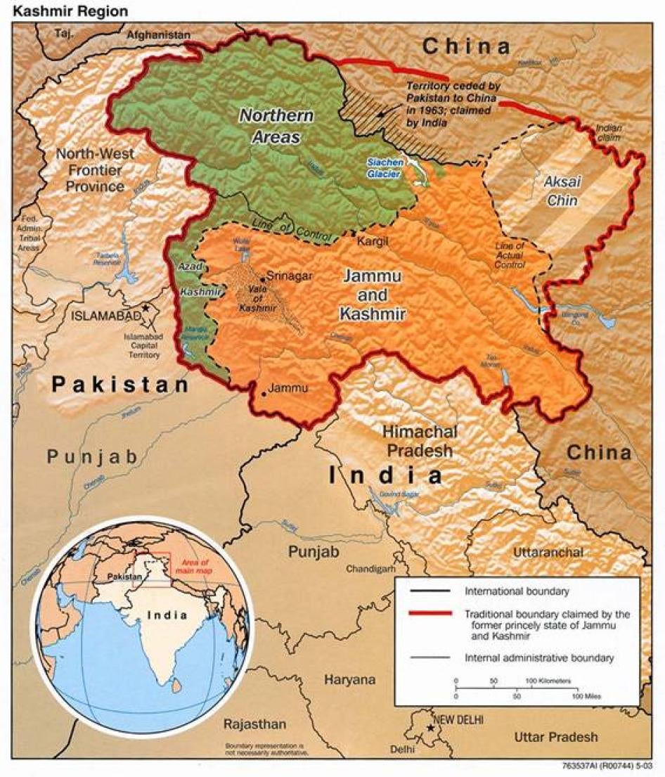 [14]Jammu and Kashmir state (which includes the Muslim-majority Kashmir valley, Hindu-majority Jammu, and Buddhist-majority Ladakh) is 101,387 square kilometers. See http://countrystudies.us/india/123.htm (retrieved July 21, 2005).