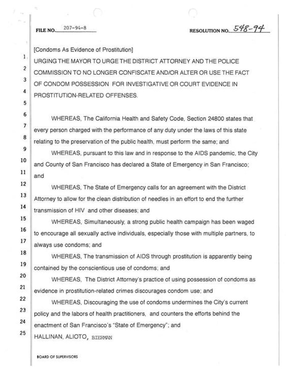 [223] San Francisco Board of Supervisors, Resolution 548-94: Condoms as Evidence of Prostitution, June 20, 1994.