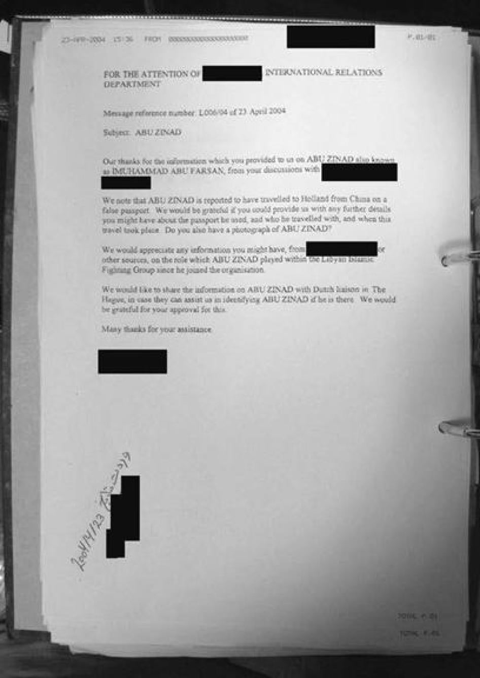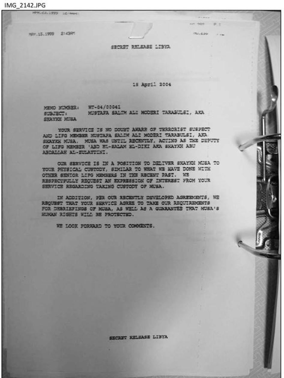 On September 3, 2011, Human Rights Watch discovered a number of Gaddafi-era files, abandoned, in the offices of former Libyan intelligence chief Musa Kusa in Tripoli.[27] Scores of those documents—several of which are presented here for the first time—provide important information on the high level of cooperation between the United States and the United Kingdom in the rendition of Gaddafi’s political opponents to Libya. (See Appendix 1 for a complete list of the documents drawn on in this report.)