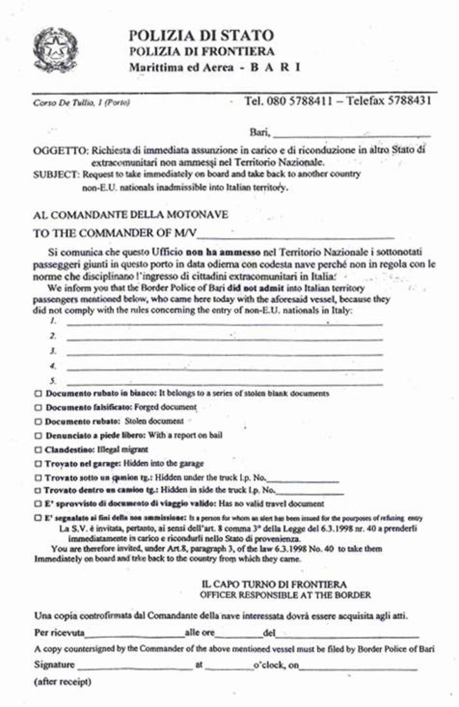[63] Bari Border Police, “Request to take immediately on board and take back to another country non-EU nationals inadmissible into Italian territory,” in Annex I. Multiple forms will be used if more than four individuals are returned at the same time. The form refers to Article 8, paragraph 3, of the Law 6.3.1998 No. 40, which due to subsequent amendments corresponds to Article 10, paragraph 3, of the Consolidated Immigration Act.