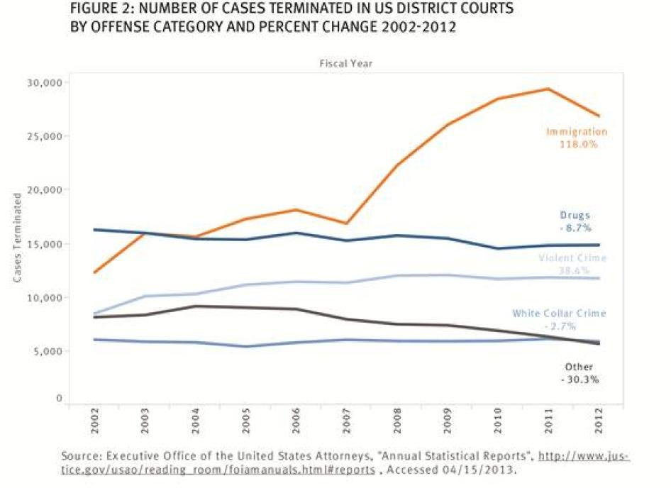 [209] US Department of Justice, Office of Justice Programs, Bureau of Justice Statistics, “Pretrial Detention and Misconduct in Federal District Courts, 1995-2010,” February 2013, http://www.bjs.gov/content/pub/pdf/pdmfdc9510.pdf (accessed April 26, 2013). In 2000, immigration defendants comprised 22 percent of suspects in US Marshals custody. By 2010, they made up nearly half (46 percent) of suspects booked by US Marshals.