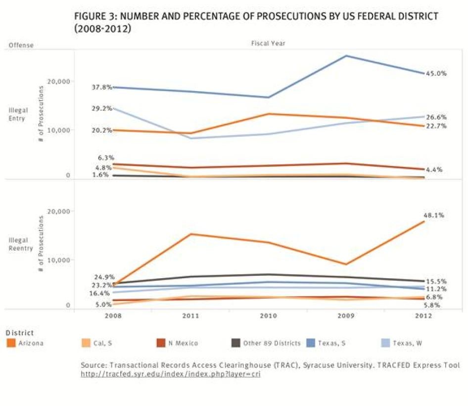 Human Rights Watch acknowledges that all sovereign states have a legitimate interest in regulating entry into their territories. We recognize that states have a particular interest in deterring the illegal entry or reentry of persons who pose a threat to public safety. The US government has decided that this is best accomplished through criminal prosecution rather than just civil enforcement of immigration law. But the prosecutions of illegal entry offenses happening today are overbroad, reaching people who do not belong in prison, and are thus draining resources that could go to efforts to increase public safety and create a more secure, efficient, and humane immigration system.