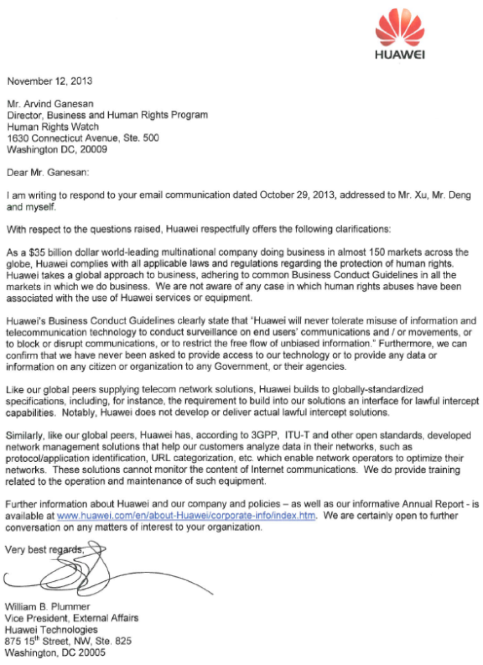 Letter from Mr. William Plummer, Huawei to Human Rights Watch
