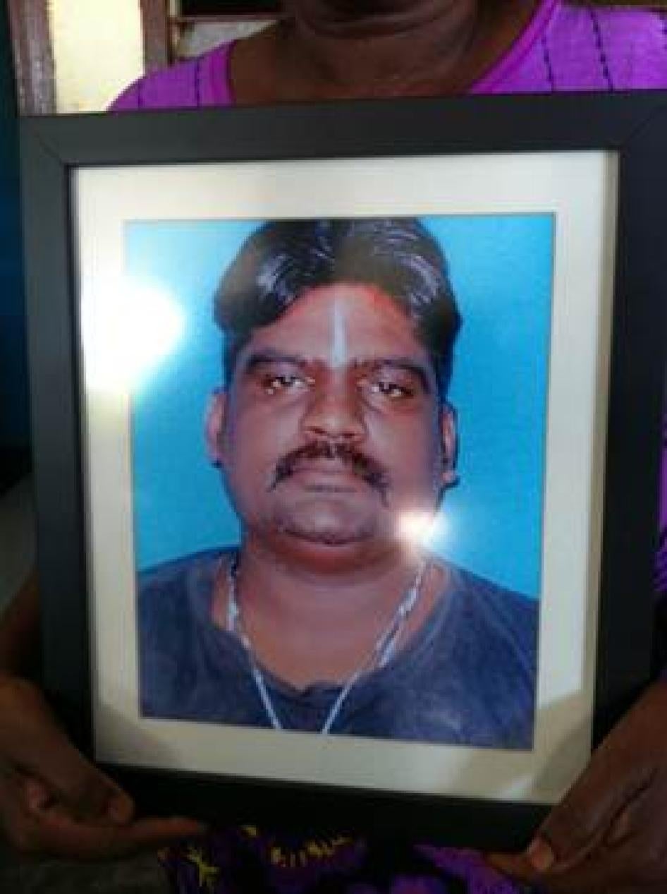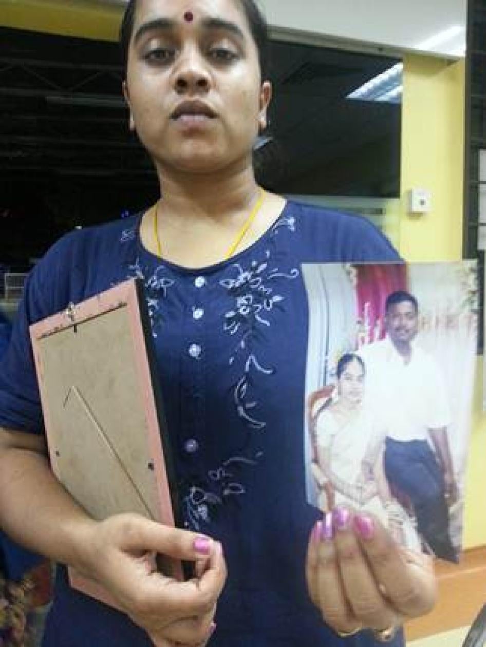 Marry Mariasusay holds a photo of her late husband, Dhamendran Narayanasamy, at the Kuala Lumpur Hospital morgue on May 22, 2013. ©2013 Human Rights Watch
