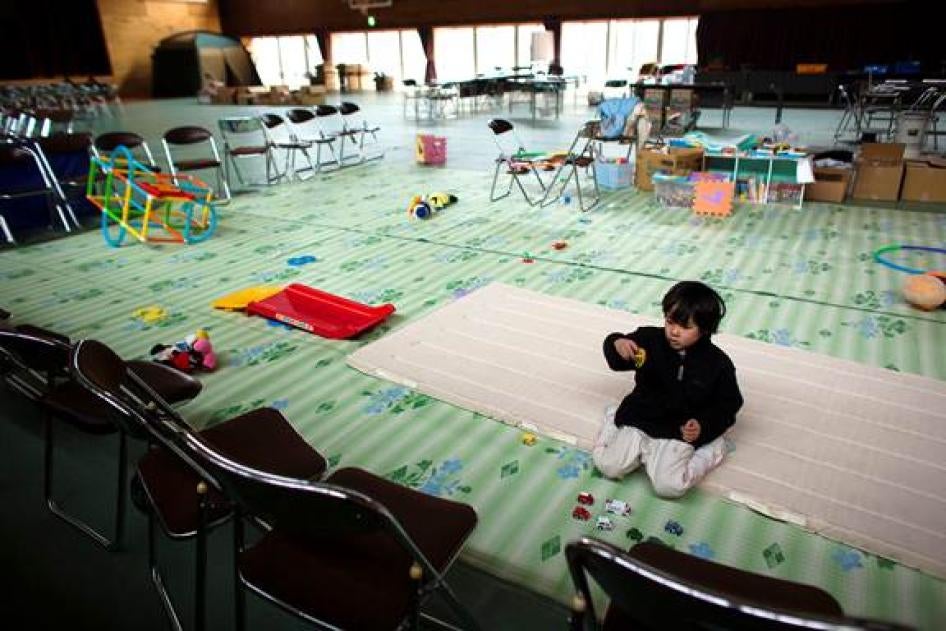 [353] Many specialists told Human Rights Watch that psycho-social care in disaster affected areas has been insufficient, including Yagi Junko and Yoshinori Sato. Junko Yagi, psychiatrist for child in Iwate Child Care Center, Iwate, at a speaking event “Play-Maker project to support children affected by the great disaster(大災害で被災した子どもを救う「プレイメーカー・プロジェクト」)” April 27.2012. Human Rights Watch interview with Yoshinori Sato, director of NPO Sendai Grief Care Association and Instructor of Psychiatric Nursing at Sendai Aoba Gakuin College, Miyagi, May 16, 2012.