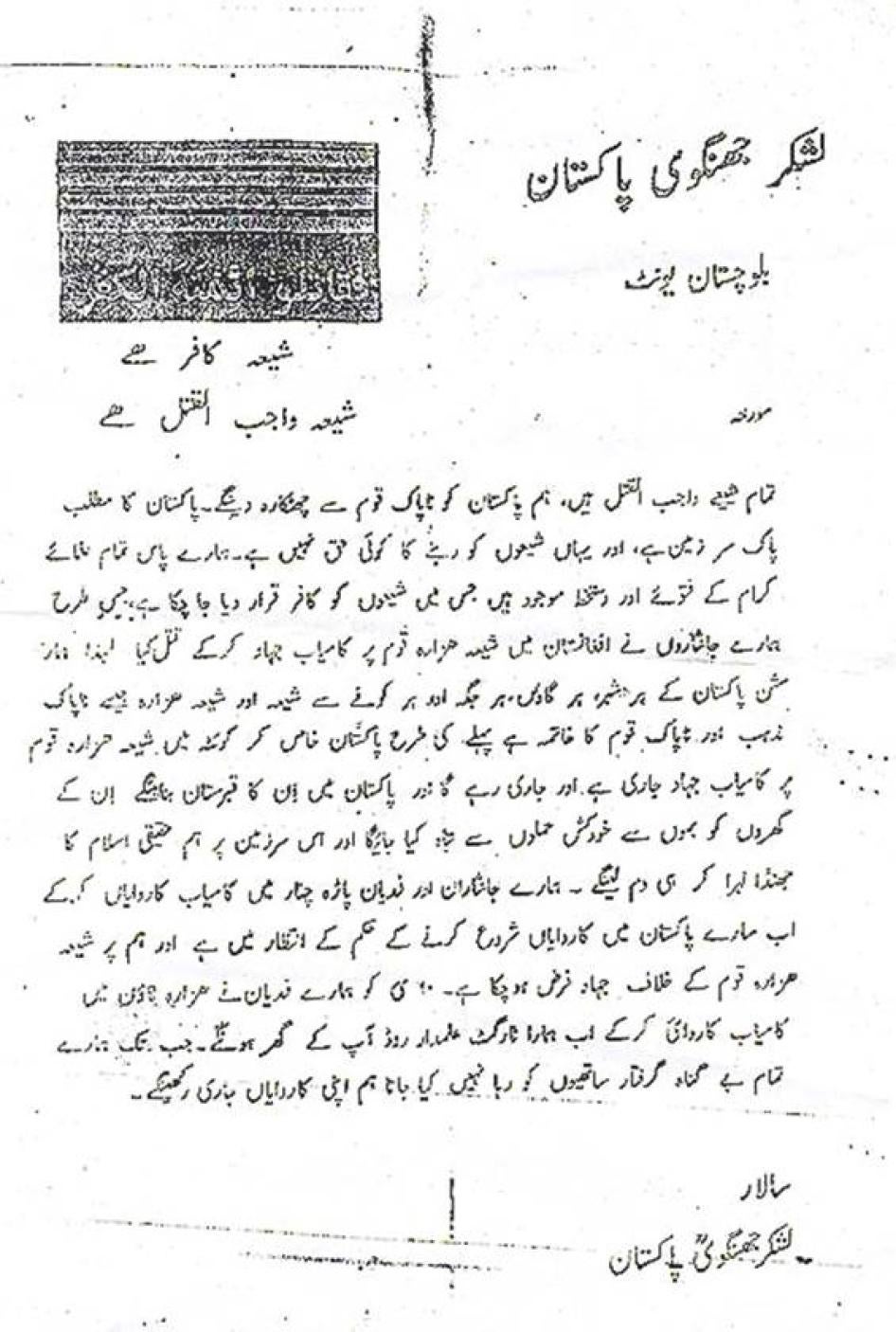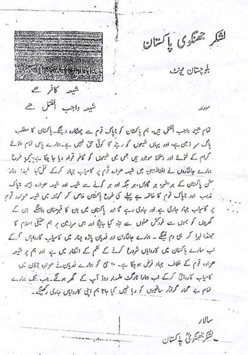 - Press the Pakistani government to uphold its international human rights obligations and promote good governance by investigating sectarian killings in Balochistan and prosecuting all those responsible, particularly the LeJ leadership, which has publicly claimed responsibility for hundreds of attacks.