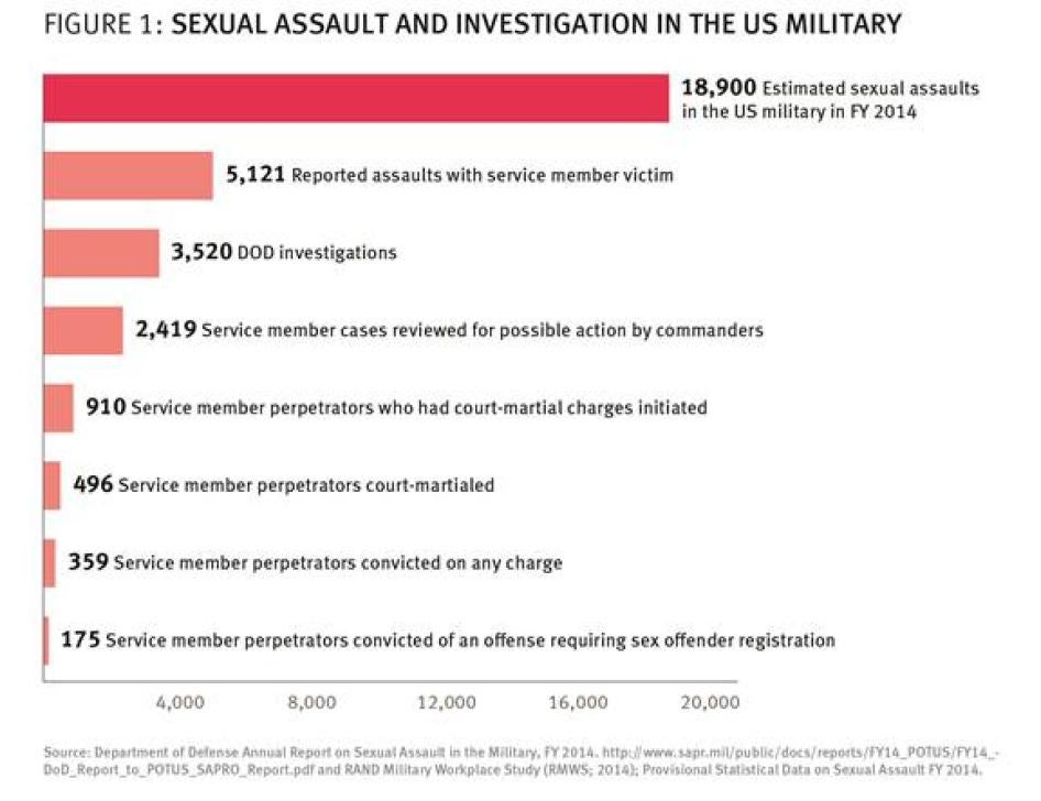 It is no secret that the US military has a sexual assault problem: the Department of Defense estimates that 18,900 US service members were sexually assaulted in fiscal year (FY) 2014.[1] But the slurs, sanctions, and scorn described above are not the punishments that soldiers and their superiors have meted out to those who have perpetrated sexual assault in the armed forces, but rather what happened to victims who reported their experiences.