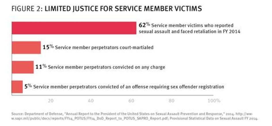 Military sexual assault survivors almost never see a remedy for these actions, for which virtually no one is held accountable. Military surveys indicate that most respondents—62 percent—who experienced unwanted sexual contact and reported it to a military authority faced retaliation as a result of reporting.[2] In other words, military service members who reported sexual assault were 12 times more likely to suffer retaliation for doing so than to see their offender, if also a service member, convicted for a sex offense. Just 5 percent (175 out of 3,261) of sexual assault cases in the Defense Department’s jurisdiction investigated with a reportable outcome in FY 2014 led to a sex offense conviction.[3]