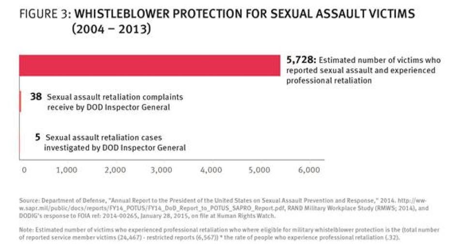 [263] Government Accountability Office, Whistleblower Protections: Actions Needed to Improve DOD’s Military Whistleblower Reprisal Program, GAO-12-362, February 2012, pp. 35-36, FN 35, http://www.gao.gov/assets/590/588784.pdf (accessed April 22, 2015).  FOIA responses from the Marine Corps Inspector General indicated it has had no whistleblower reprisal complaints related to reporting a sexual assault between 2007 and 2013 (Letter from S.A. Hughes, Head, FOIA/PA Section, Department of the Navy, United States Marine Corps, May 30, 2014, on file at Human Rights Watch). The Navy, Army, and Air Force indicated they do not keep track of their whistleblower complaints in such a way that would enable them to determine if the complaints relate to sexual assault. According to DODIG Reports to Congress, the number of military whistleblower complaints substantiated after IG investigation were 27 (6 percent) in FY 2014; 13 (3 percent) in FY 2013; and 20 (7 percent) in FY2012. DODIG Semi-Annual Report to Congress: April 1, 2012 to September 30, 2012; DODIG Semi-Annual Report to Congress: April 1, 2013 to September 30, 2013 DODIG Semi-Annual Report to Congress: April 1, 2014 to September 30, 2014; DODIG Semi-Annual Report to Congress: October 1, 2012 to March 31, 2013; DODIG Semi-Annual Report to Congress: October 1, 2013 to March 31, 2014.