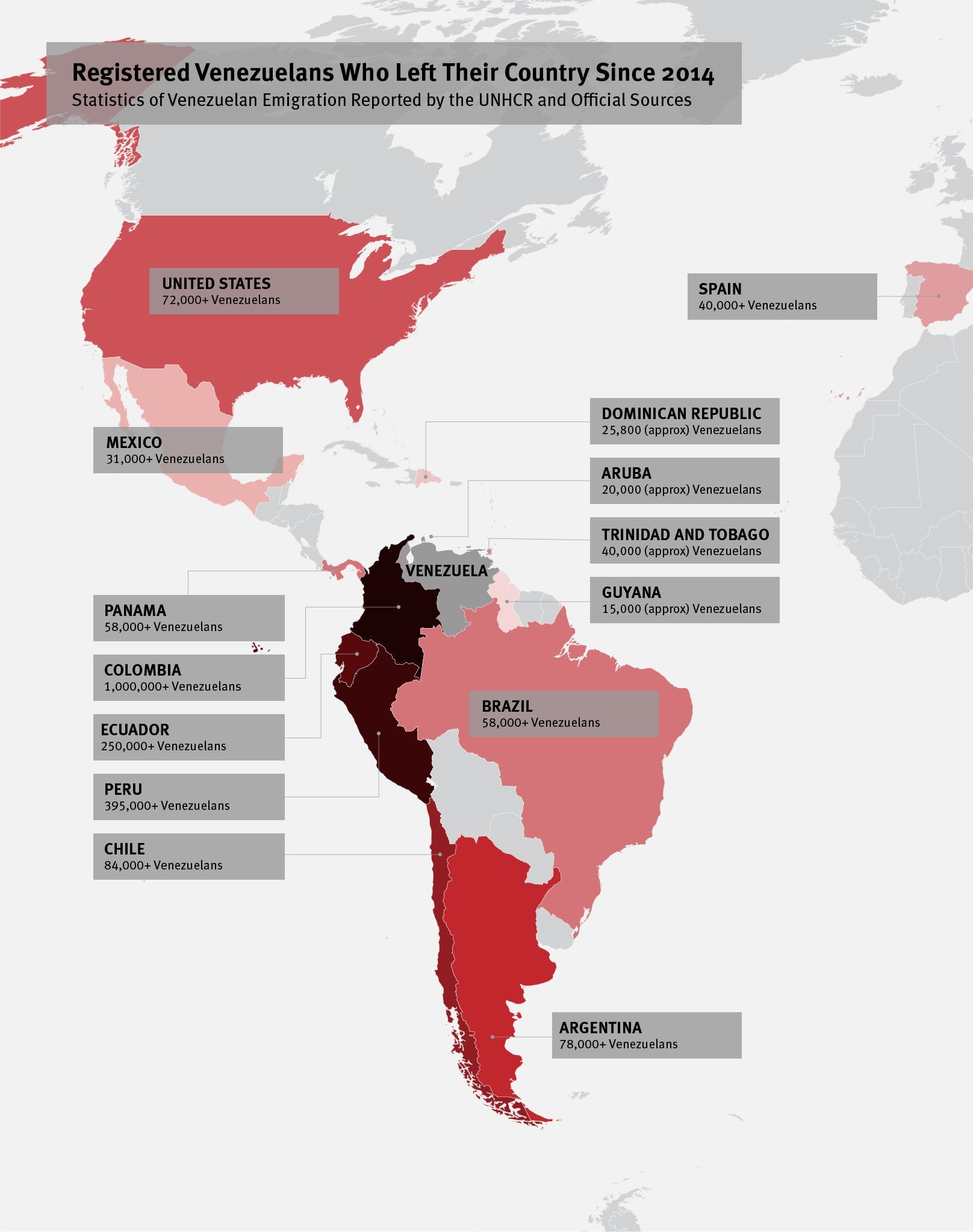 The countries that have received the largest numbers of Venezuelans since 2014 are: