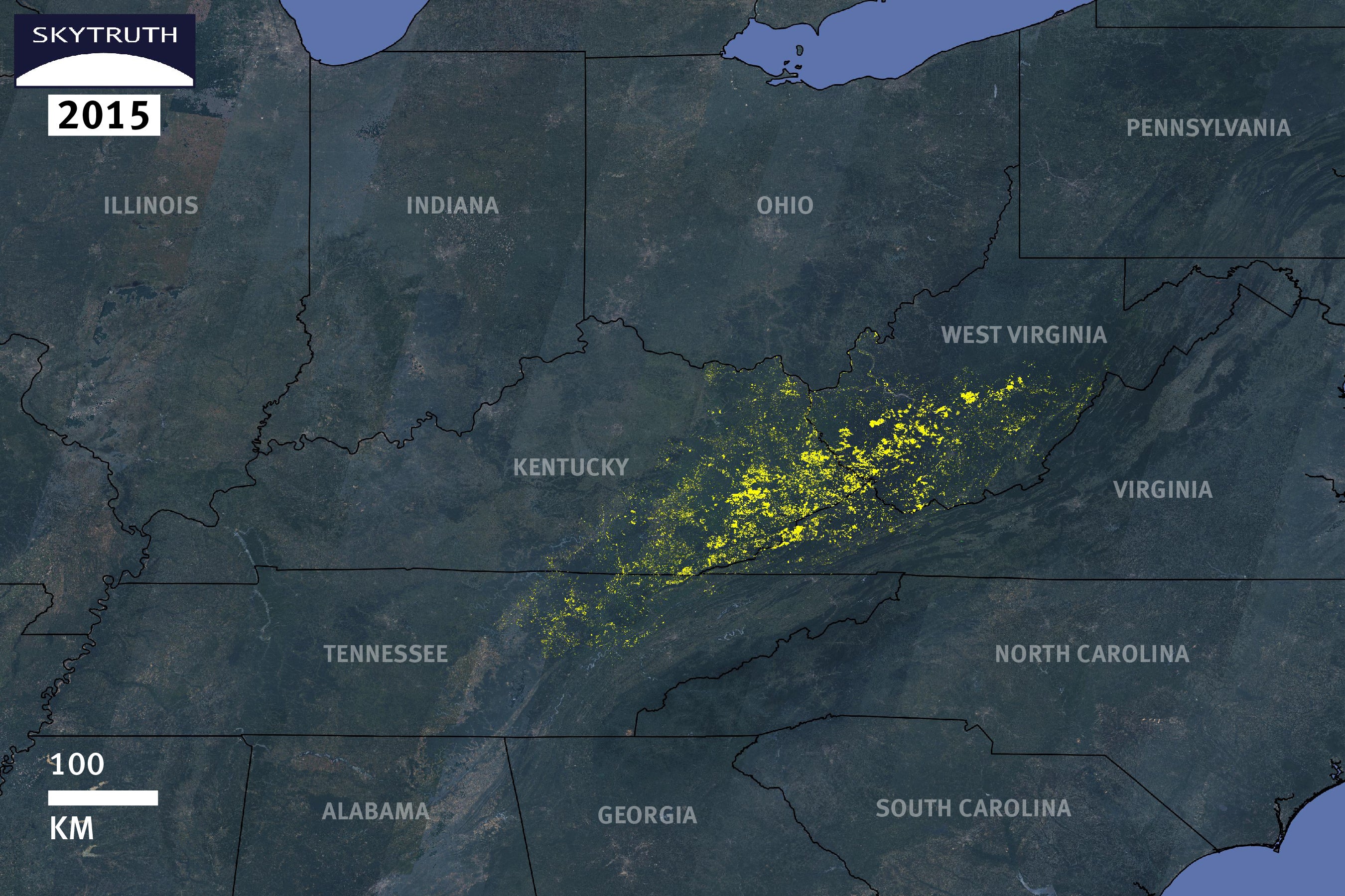 Between 1985 and 2015, 2,900 square kilometers (1,120 square miles) of land, an area around the size of Rhode Island, was newly surface mined in central Appalachia, according to a mapping project using satellite imagery that was done by SkyTruth, Appalachian Voices, and Duke University.[59] A separate Appalachian Voices study, based on satellite imagery and mining permit data, found that by 2009, mountaintop removal had severely impacted or leveled more than 500 mountains.[60] These figures update the scarce publicly available government data on the extent of mountaintop removal. In 2002, the EPA calculated that permits approved in the prior decade allowed coal companies to mine around 1,600 square kilometers of forested mountain – roughly three to four percent of the Appalachian coal region.[61] A separate EPA-commissioned study found that few trees, or even shrubs, survive on the reclaimed mines, threatening 244 terrestrial species and eliminating a major source of carbon capture.[62] Although the amount of mountaintop removal has significantly declined over the past decade, it continues to produce millions of tons of coal per year, particularly in southern West Virginia.[63]