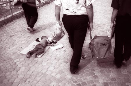 A Roma child begs on the streets of Skopje, Macedonia.