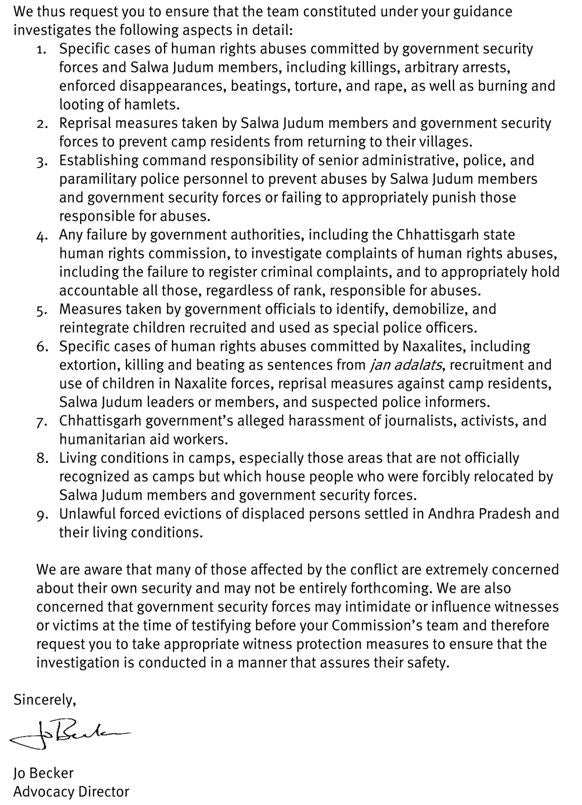 Appendix IIApril 28, 2008 Sri E.S.L. Narasimhan Dear Governor Narasimhan: Human Rights Watch is an independent, non-governmental international organization that monitors human rights developments in over 70 countries around the world. We would like to draw your attention to the failure of the Andhra Pradesh government to properly address the needs of internally displaced persons (IDPs) from Chhattisgarh, who fled there because of the conflict between the Naxals and the Salwa Judum and government security forces. Not only have they suffered loss of livelihood and property as they fled from their homes, but they have also faced unlawful forced evictions by Andhra Pradesh forest officials without any regard to their security and well being. As recently as on April 5, 2008, there was a violent crackdown by the Andhra Pradesh forest department against an IDP settlement in Kothooru in Khammam district. We are happy to learn that you participated in an official meeting on April 8, 2008 in Bhadrachalam to jointly work with the Andhra Pradesh government to safeguard the interests of tribal communities. We also appreciate you for having given several local activists and IDPs the opportunity to present their case before you. We have received a copy of the written representation that they submitted to you and hope that you will take into account their concerns, and make a decision in accordance with the United Nations Guiding Principles on Internal Displacement, which would protect the rights of the displaced tribal communities. In late 2007 Human Rights Watch traveled to Khammam and Warrangal districts of Andhra Pradesh to investigate the plight of IDPs settled in these areas. In interviews with us, these villagers said that they were reluctant to return to Chhattisgarh until there was a concrete plan by the government to ensure their safe return in consultation with them. The UN Guiding Principles on Internal Displacement, while not a binding instrument, reflect and are consistent with international human rights and humanitarian law. They provide that displaced persons have the rights to seek safety in any part of the country, to liberty and freedom to choose their residence, and to protection against forcible return to or resettlement in any place where their life, safety, liberty or health would be at risk. Displaced persons also have the right to an adequate standard of living. They also state that plans for relocation and rehabilitation should be drawn up in consultation with displaced persons, especially women. Unfortunately, the Andhra Pradesh forest department has repeatedly unlawfully forcibly evicted and relocated many IDPs without developing a safe rehabilitation arrangement in consultation with them. The Andhra Pradesh authorities have also failed to extend government welfare benefits to many IDPs. Persons displaced by the infighting in Chhattisgarh have a right to seek safety, protection, and humanitarian assistance in any part of India including Andhra Pradesh. We urge you to use your extraordinary powers under the Fifth Schedule of the Indian Constitution and ensure that: