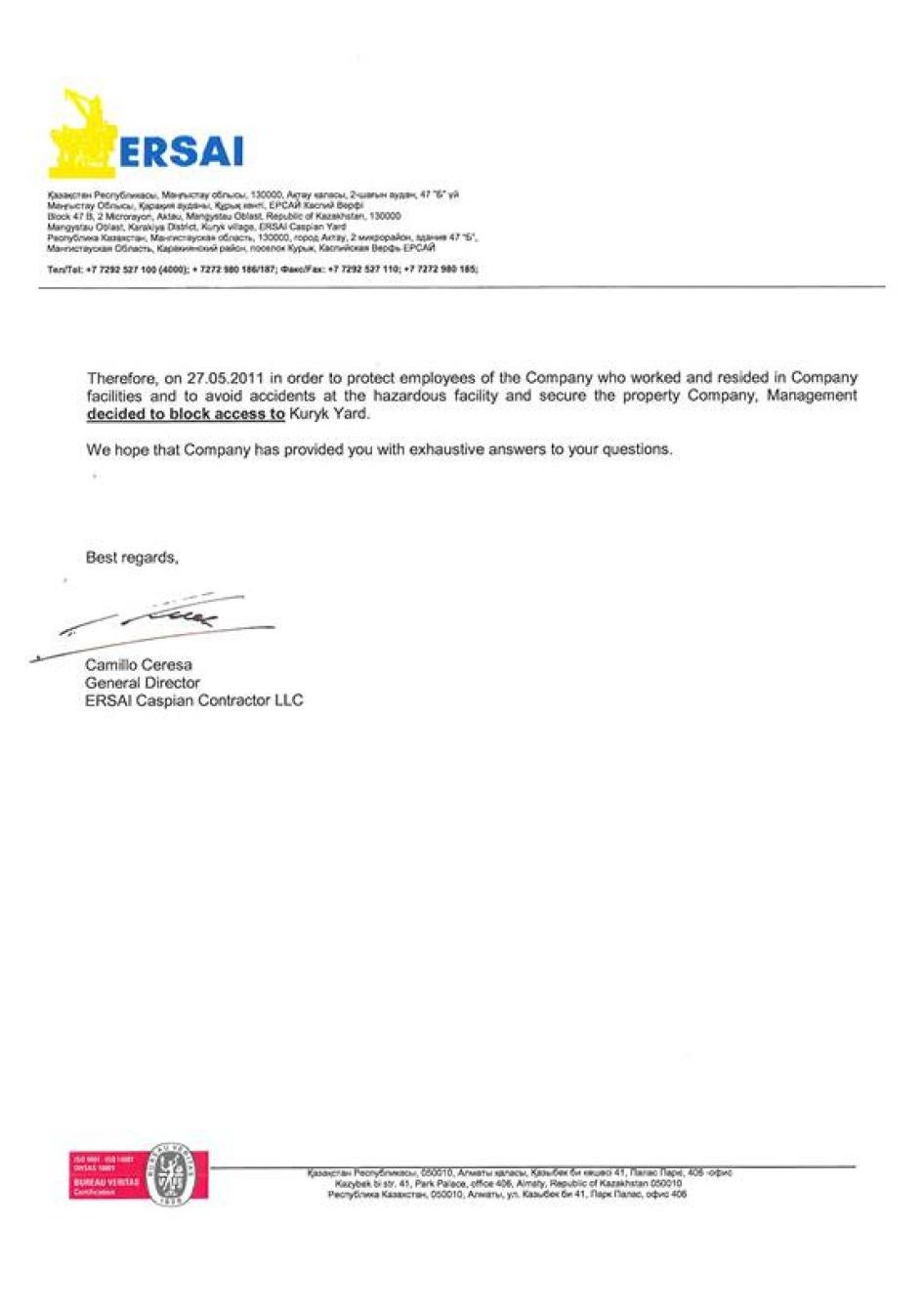 [297] Письмо генерального директора «ЕРСАЙ Каспиан Контрактор» Камилло Черезы Хьюман Райтс Вотч от 2 марта 2012 г.