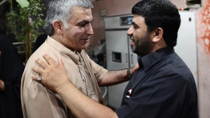 Human rights activist Nabeel Rajab (left) speaks to his neighbor after his release from jail on May 24, 2014. Authorities arrested Mr. Nabeel again on October 1, 2014, after he criticized the government.